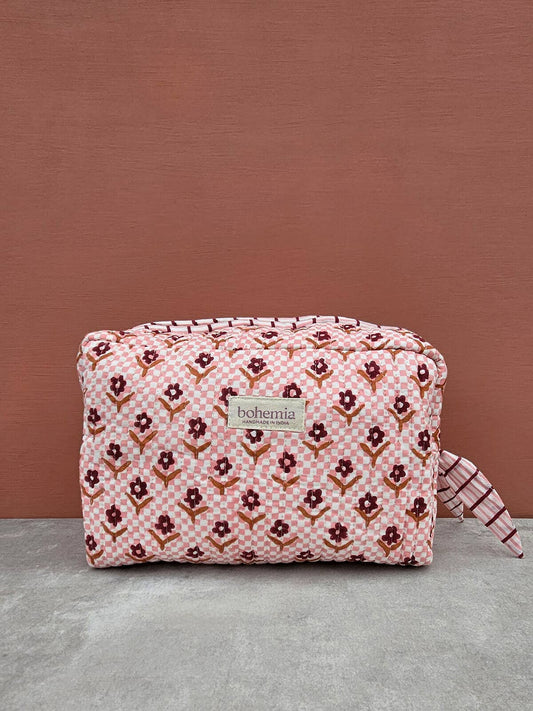 Medium Daisy Check Block Printed Cosmetic Wash Bag Handmade in India