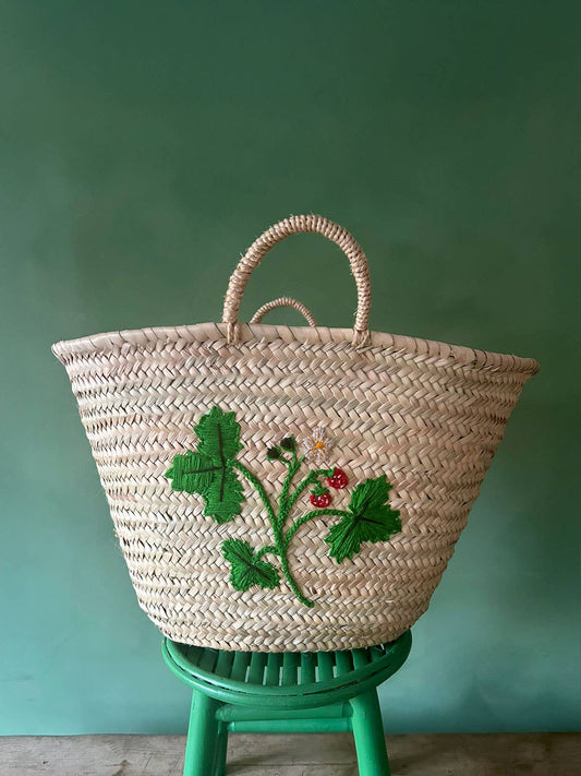 Hand Embroidered Market Basket, Wild Strawberry