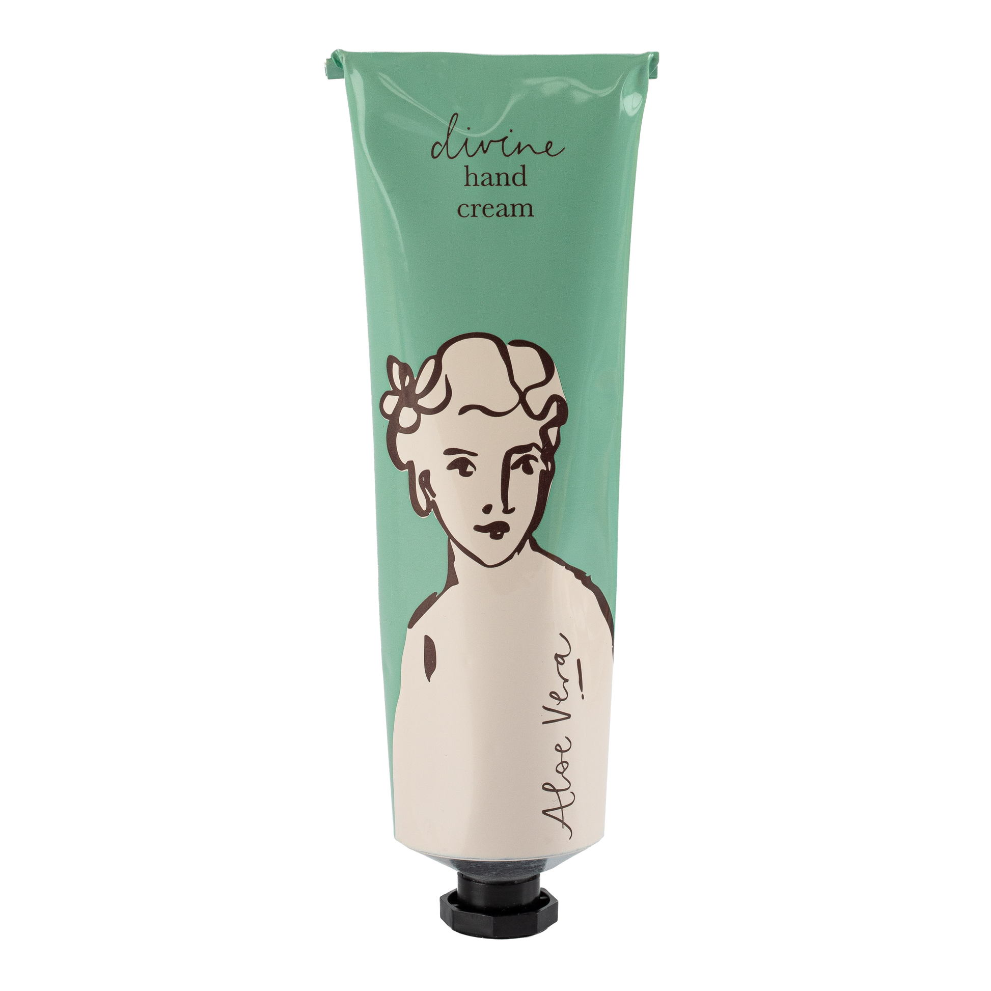 Our aloe vera-scented hand cream comes in a tube within a matching green box with gold foil writing featuring the divine lady by Wanderlust.