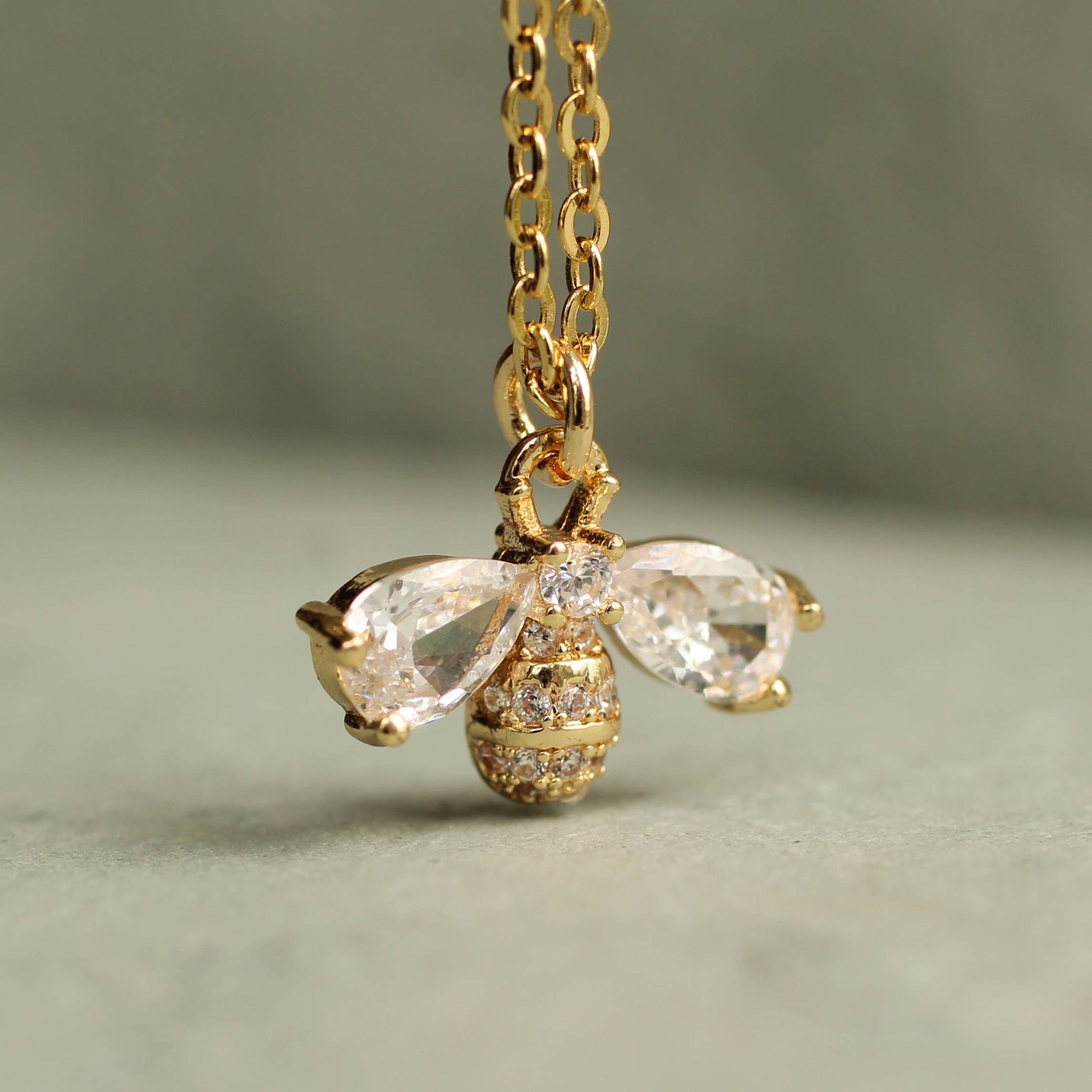 This sweet and delicate bee necklace has cut glass crystal wings, and its body features three rows of tiny pavé crystals to create a striped bumble bee effect!