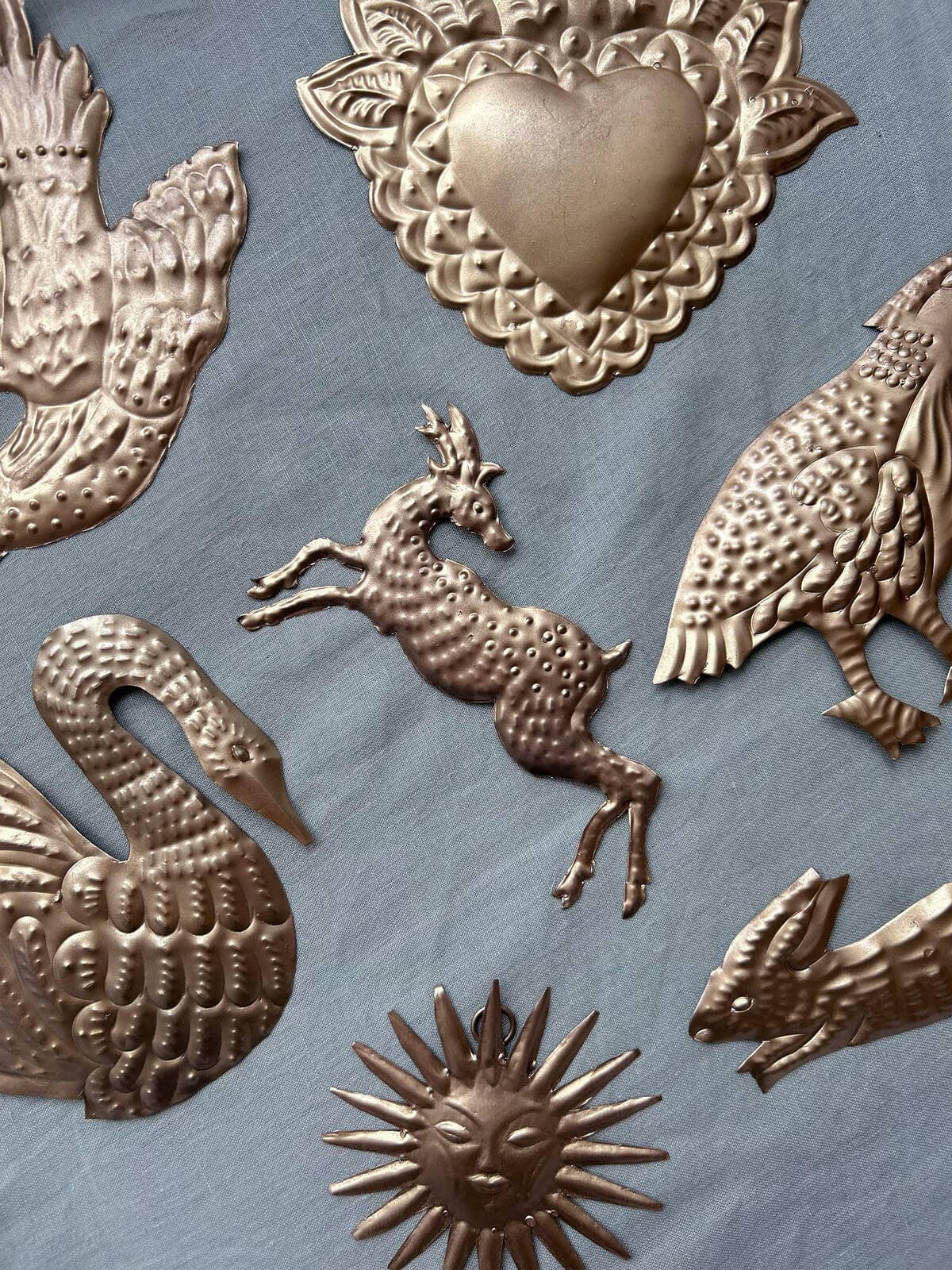 Inspired by milagro ‘miracle’ votives, these embossed metal decorations are crafted to bespoke illustrations drawn from Celtic folklore and nature.