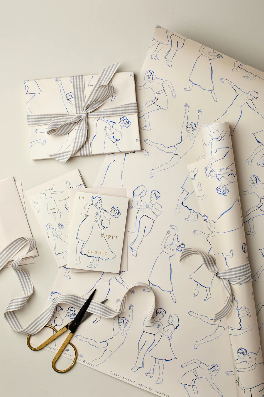 Painted blue dancers on a light grey card, adorned with a gold foil greeting which reads 'To the Happy Couple'. This card is paired with a matching grey envelope.