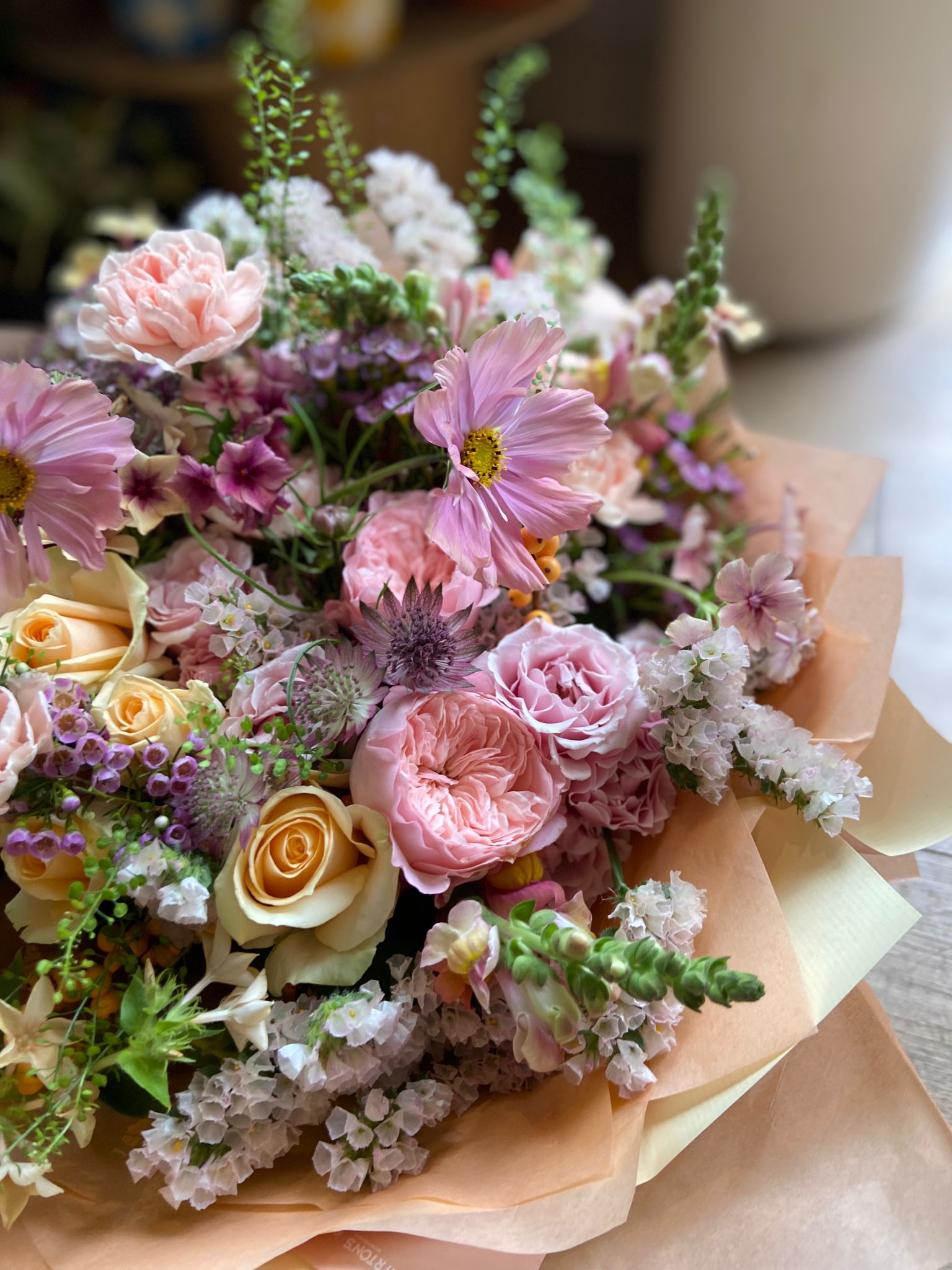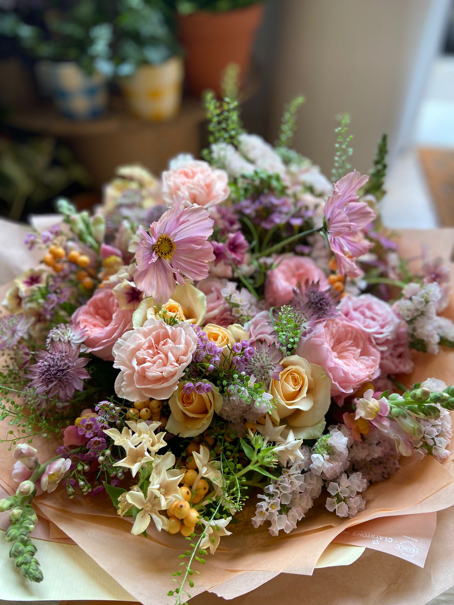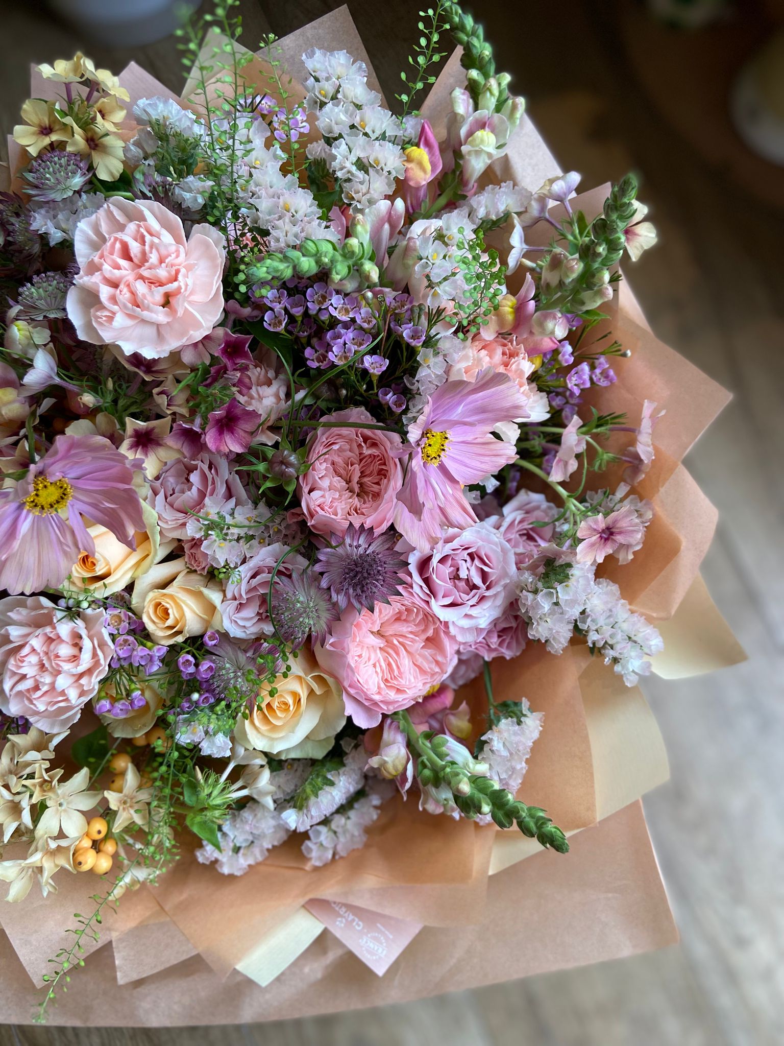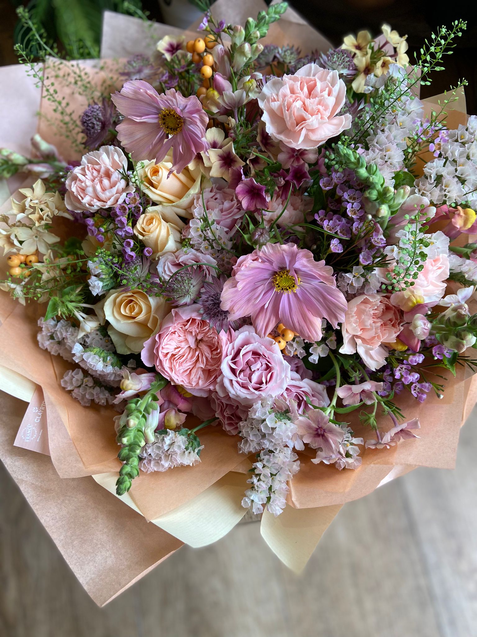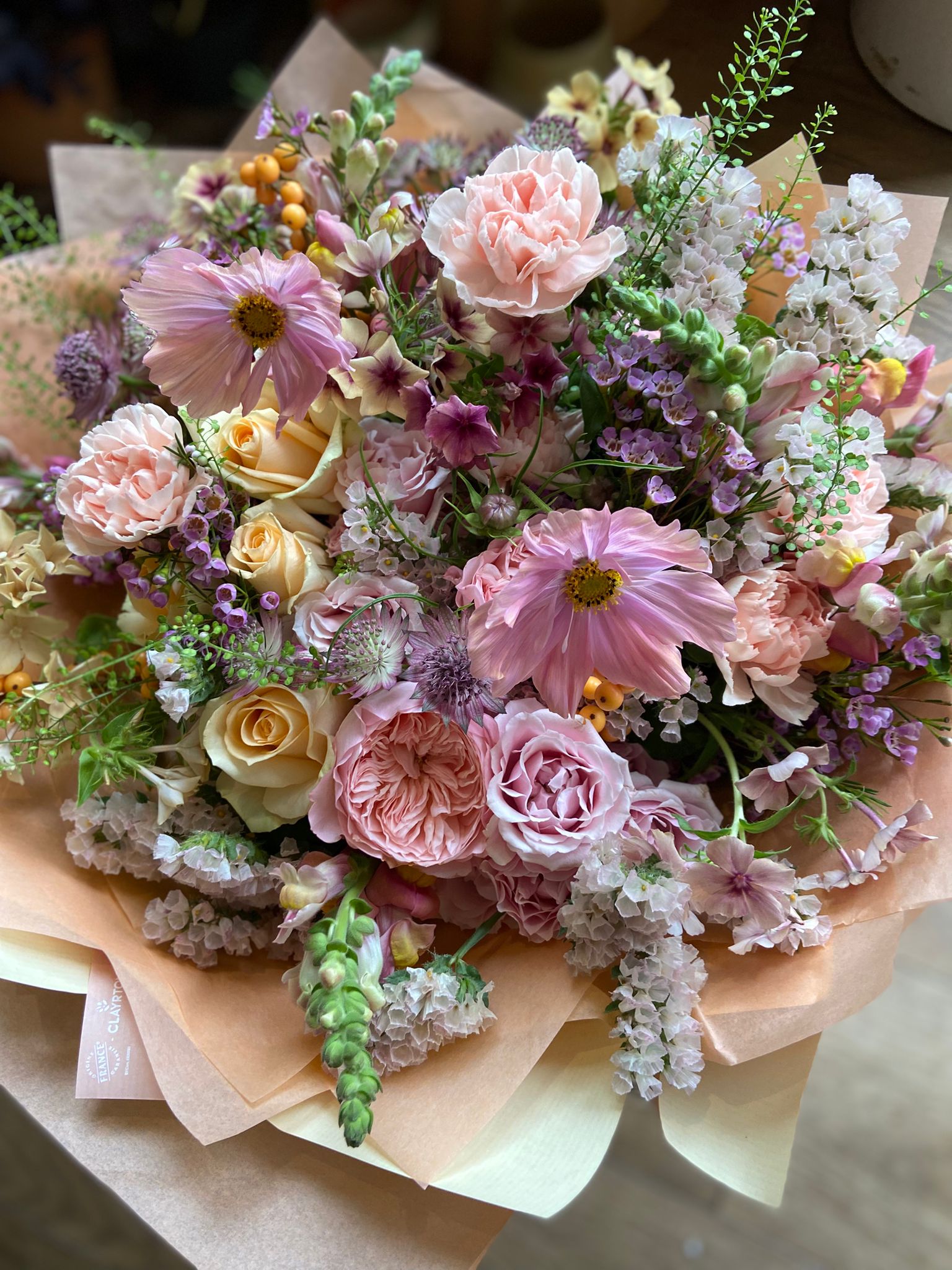 Four varieties of premium Roses fill this bouquet, along with scented Carnations, Ilex Berries, Snapdragons and Astrantia in creamy peaches, pinks and whites.