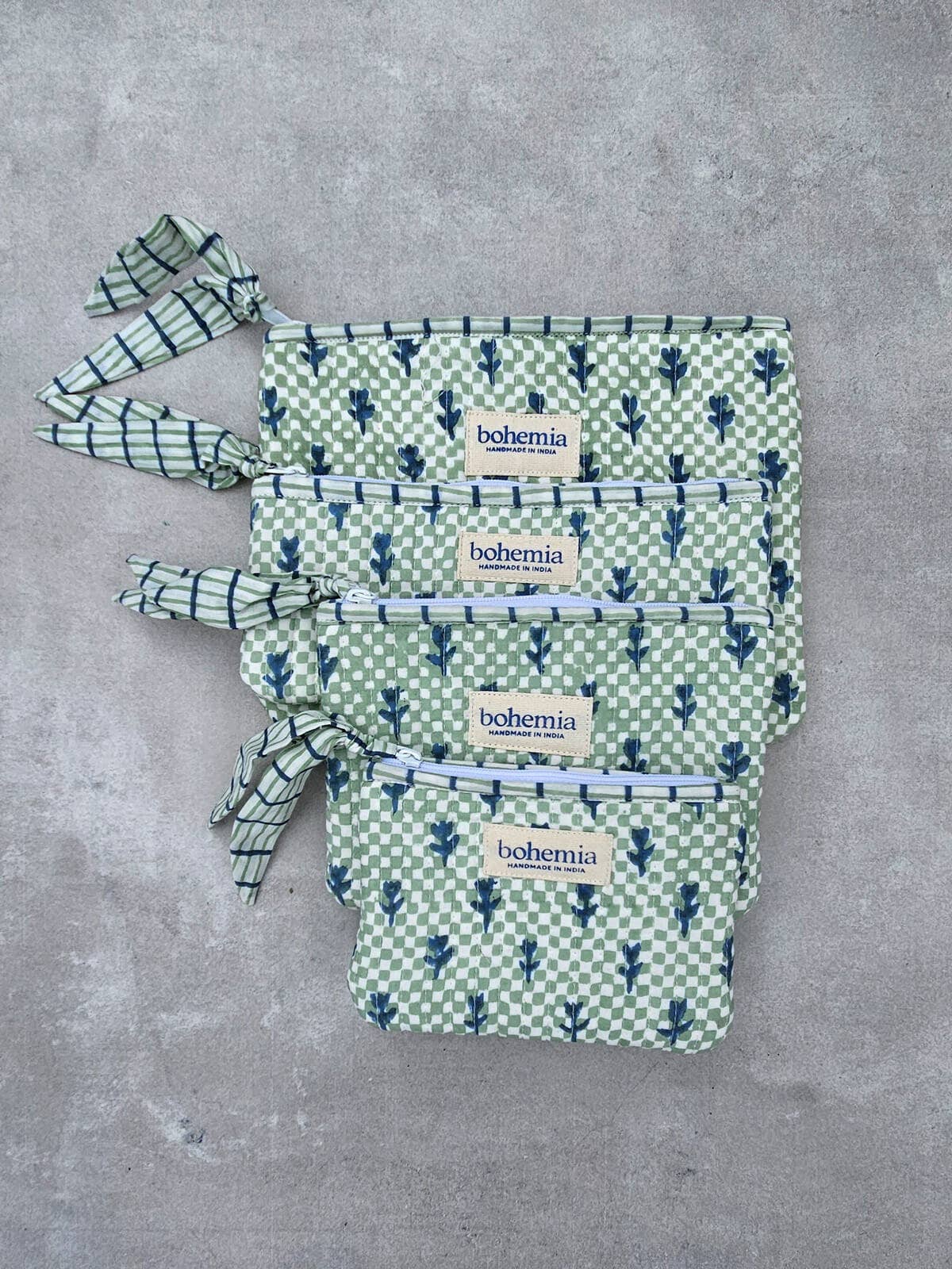 A delightfully quirky hand block print inspired by cottage gardens and their blooming borders, the quilted cotton Tulip Zip Pouch features a sweet combination of tulips on graphic check in blue and sage green.